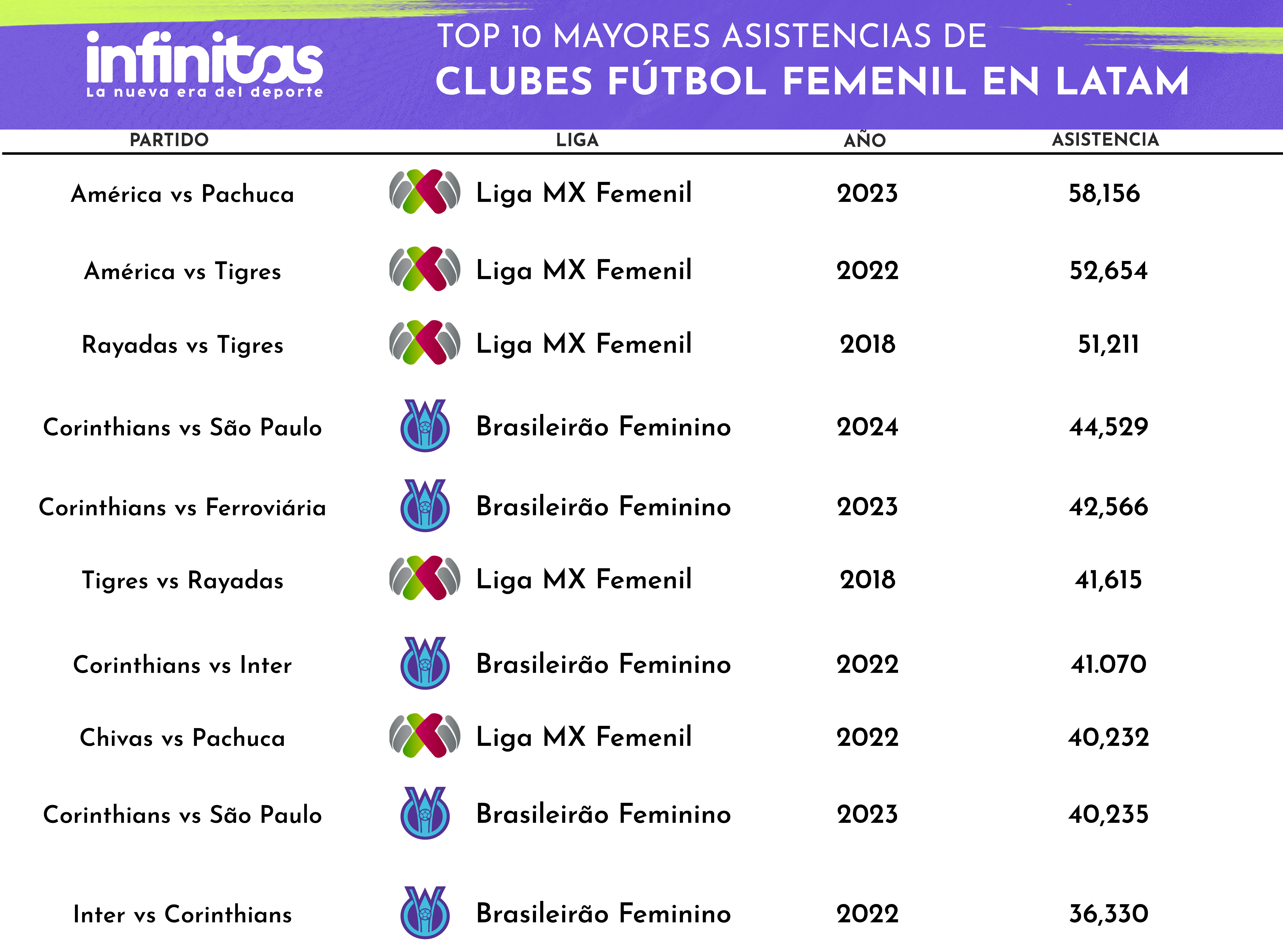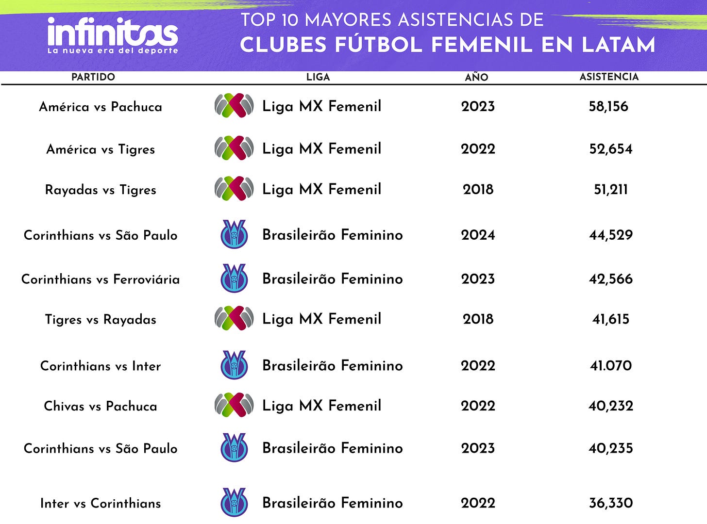 A pesar de que la Liga Femenil MX y la Liga Brasileña (Brasileirão Feminino) han tenido muy buenas asistencias en partidos concretos, y hay equipos con promedios sobresalientes, la realidad es que la disparidad es enorme con algunos equipos recibiendo a menos de 1,000 asistentes por partido.