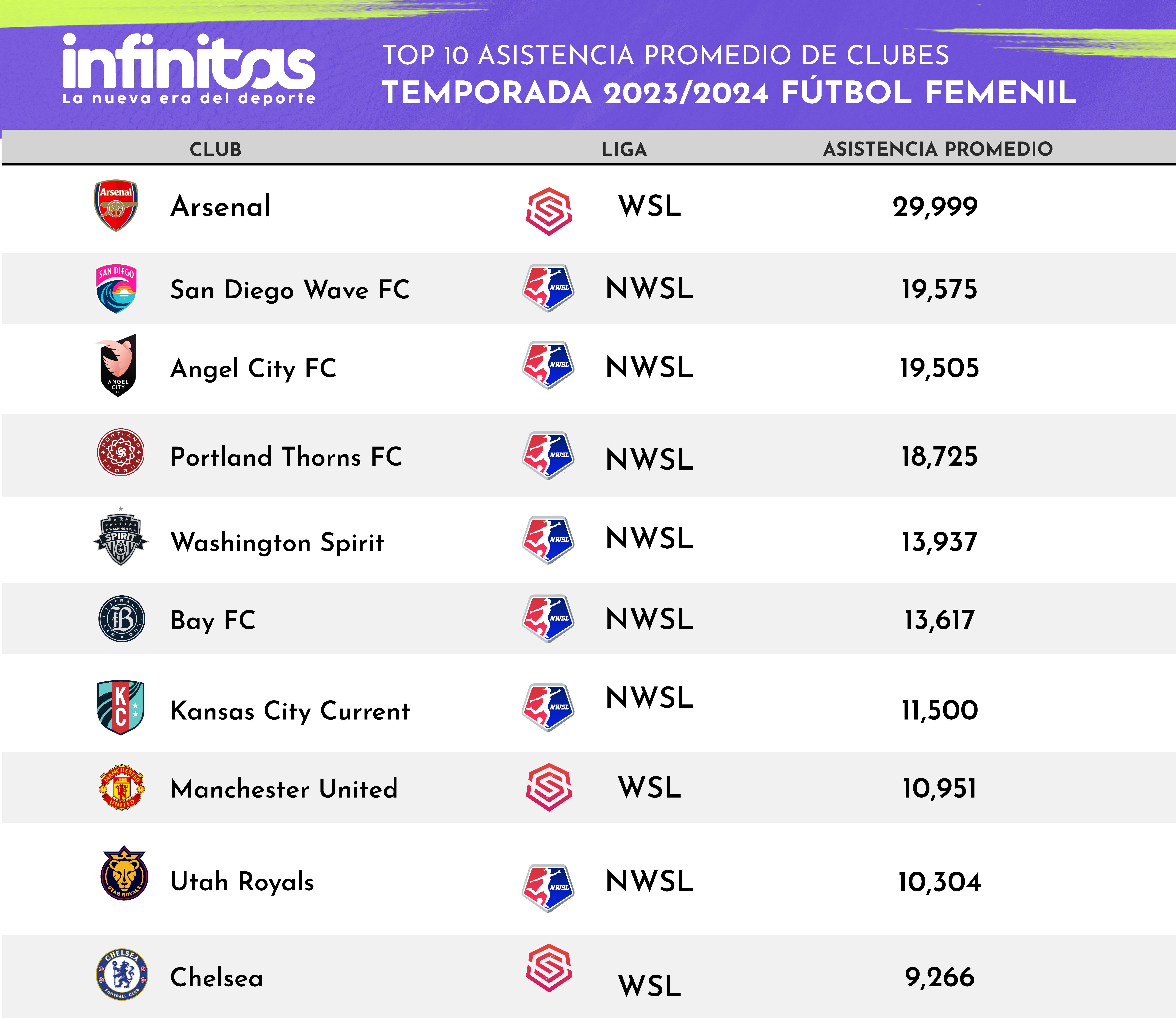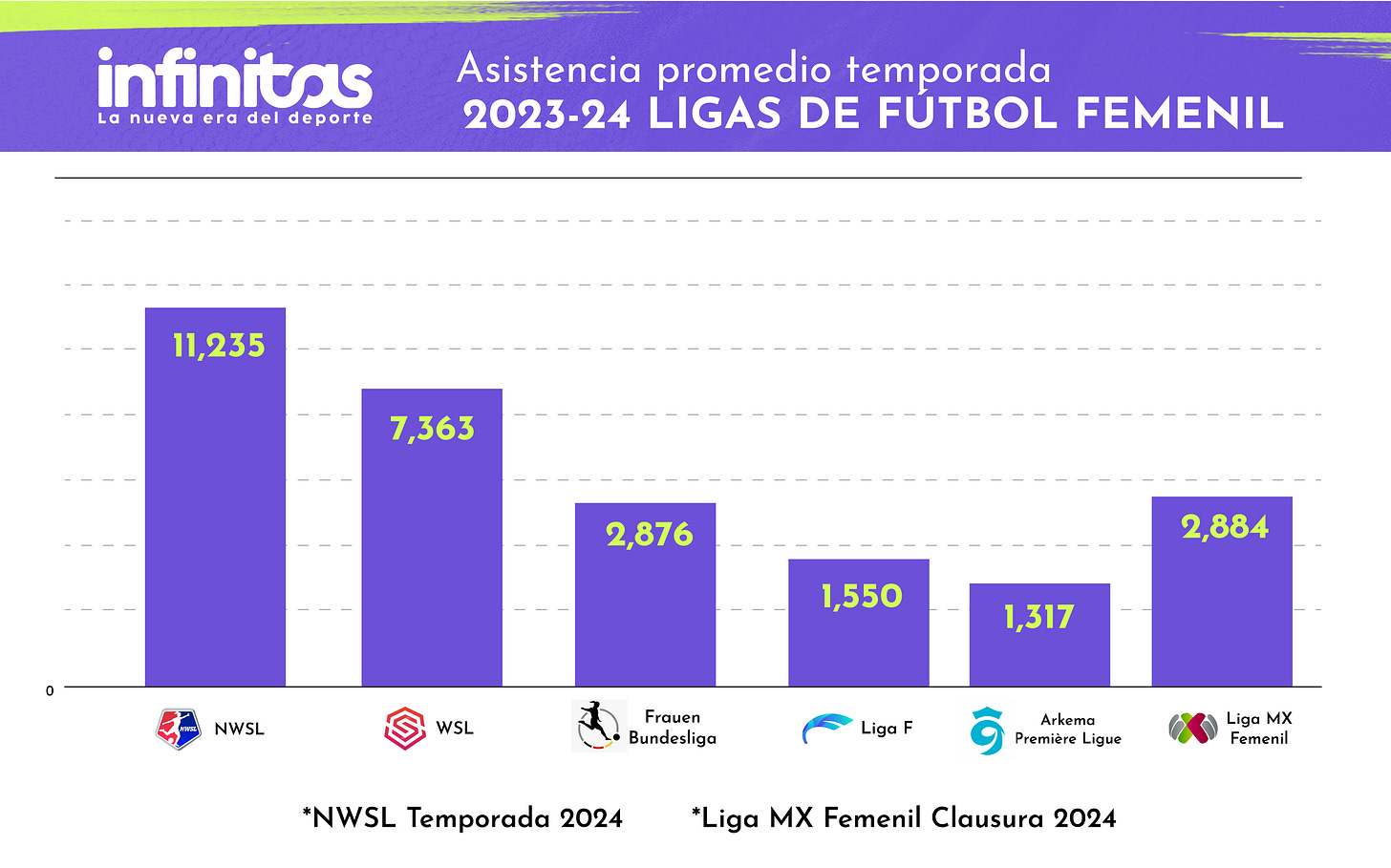Según un informe de Two Circles, la asistencia promedio en las cuatro principales ligas europeas (Frauen-Bundesliga, WSL, Liga F, D1) creció un 24% en 2023-24, con la WSL a la cabeza con un 41%. Sin embargo, la NWSL sigue siendo la liga de fútbol femenino con mayor asistencia del mundo, casi duplicando su asistencia media de 5,339 en 2021 a 11,235 en 2024.